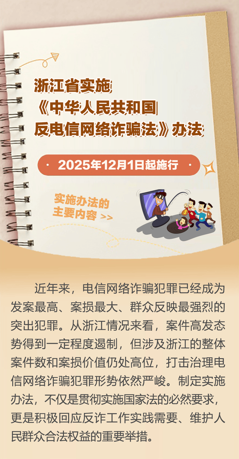 近日,浙江省第十四届人大常委会第十九次会议审议通过了《浙江省实施〈中华人民共和国反电信网络诈骗法〉办法》,将于2025年12月1日起施行。该实施办法是全国范围内第一部反诈领域的地方性法规。